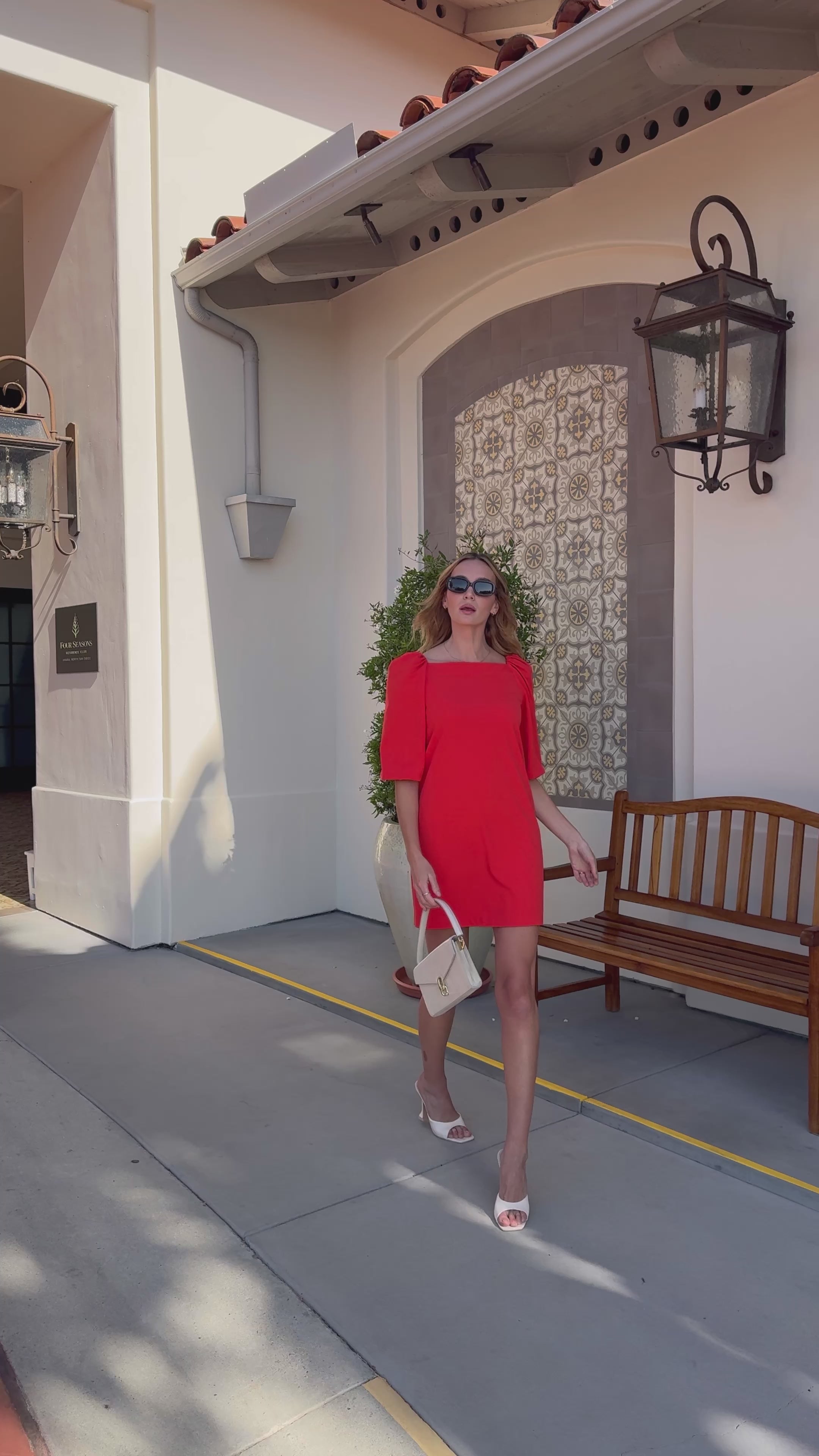 A striking silhouette adds eye-catching style to this short-sleeve shift dress with a flattering square neckline, elbow-length balloon sleeves, and an easy shift silhouette.