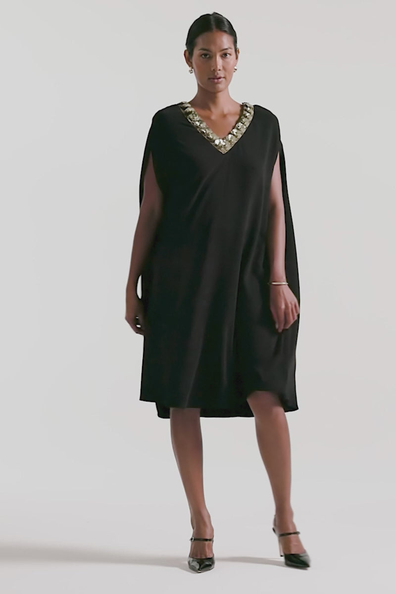 This breezy a-line cape dress is your showstopping style of the season. This elegant evening dress features short dolman sleeves and gold embellishment around the V-neckline. It is made of smooth compact weave stretch suiting for a breezy finish.