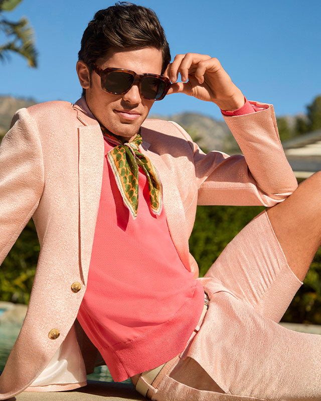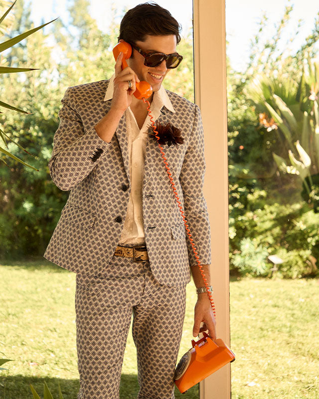 Our best-selling blazer is refreshed for the season in a fresh, tropical floral print on a comfortable cotton-stretch blend. This classic, tailored fit is finished with a notch lapel, front flap pockets, inside welt pocket, and a single-breasted, double-button front. Pair this bold blazer with our matching Clyde Slim Trouser or Lawrence Short for a complete suit.