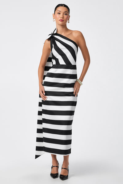 Take your event dressing to the next level in this bold, midi-length dress with a self bow and train at the shoulder. Featuring an elegant, feminine silhouette, this one-shoulder dress is sleeveless and finished with a side-seam zip closure. It is made of our smooth, high-shine striped satin for a chic touch.